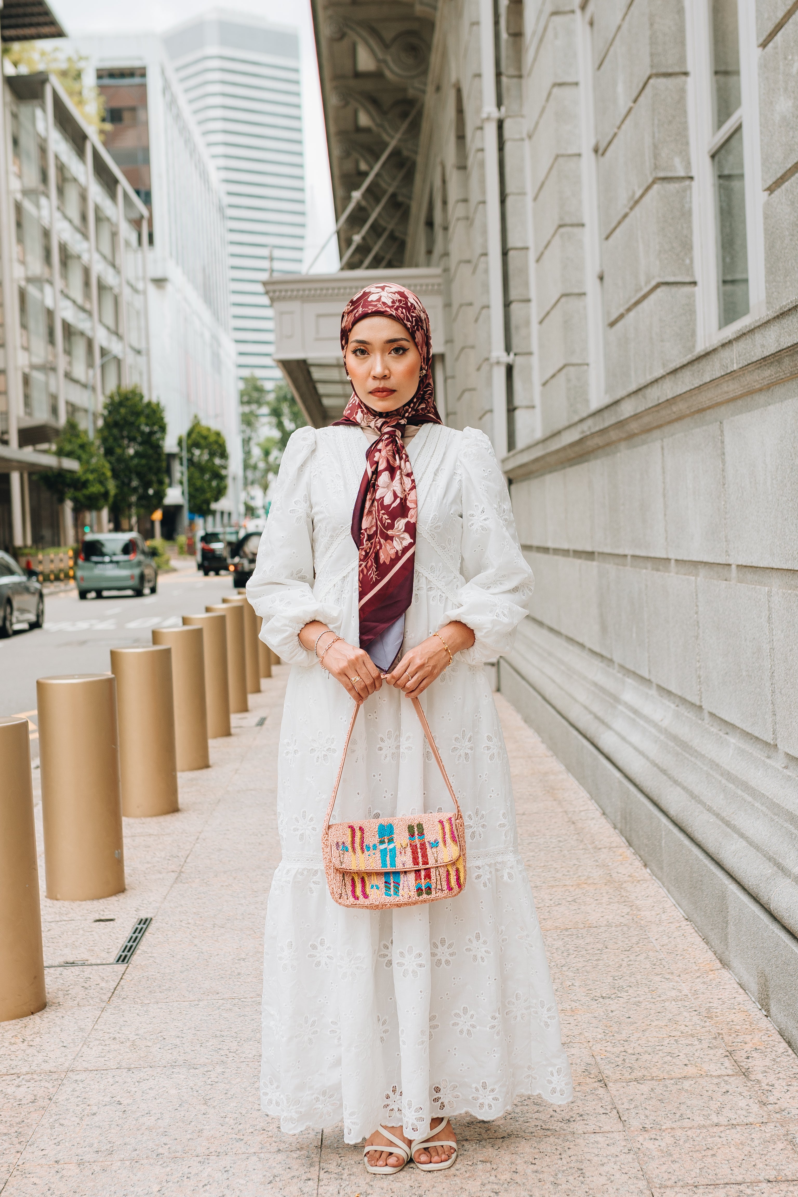 The dress features a modest, flowy silhouette with softly gathered tiers that create graceful movement with every step. Elegant puff sleeves and a tailored bodice complete the look, offering a flattering balance between structure and relaxed comfort.