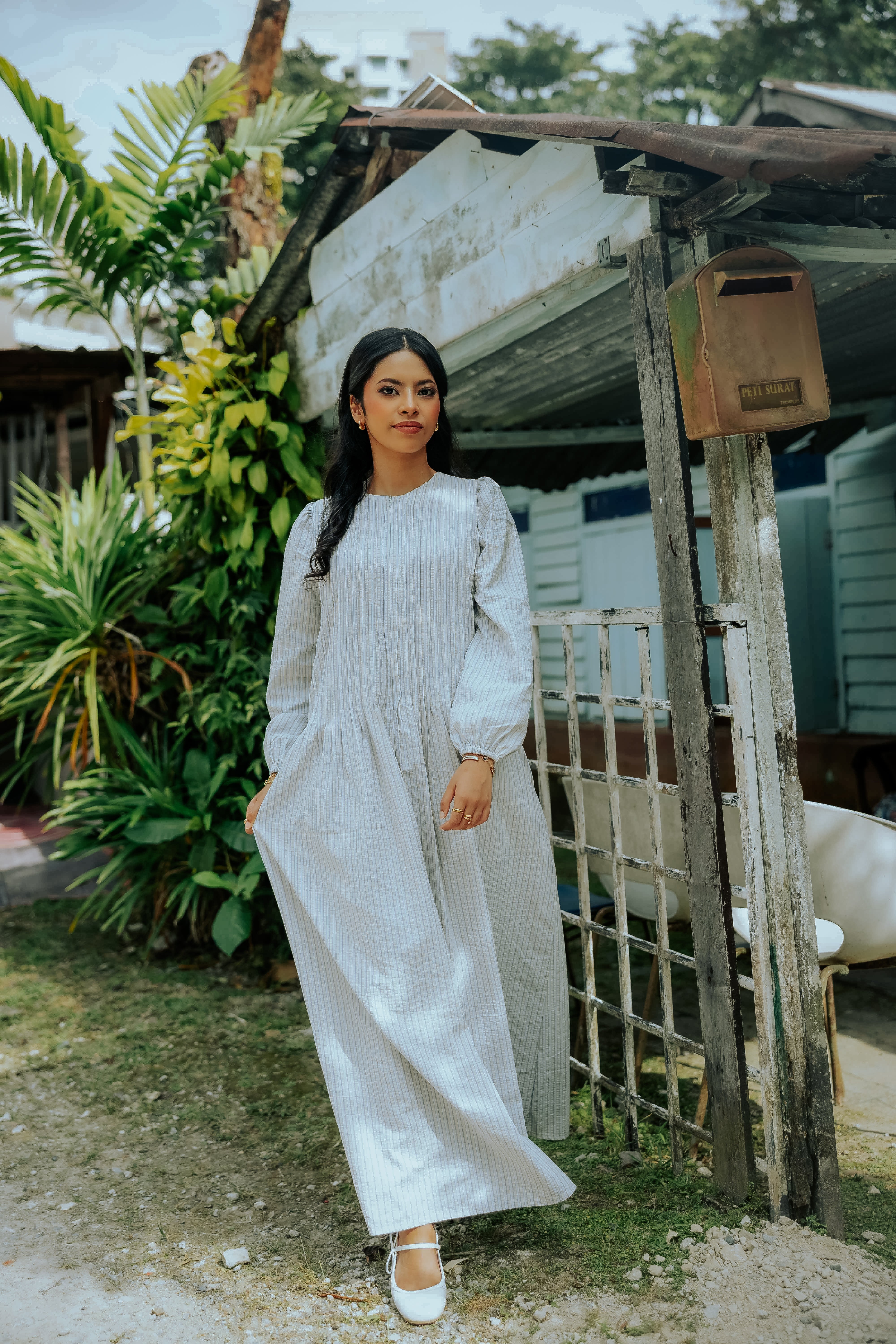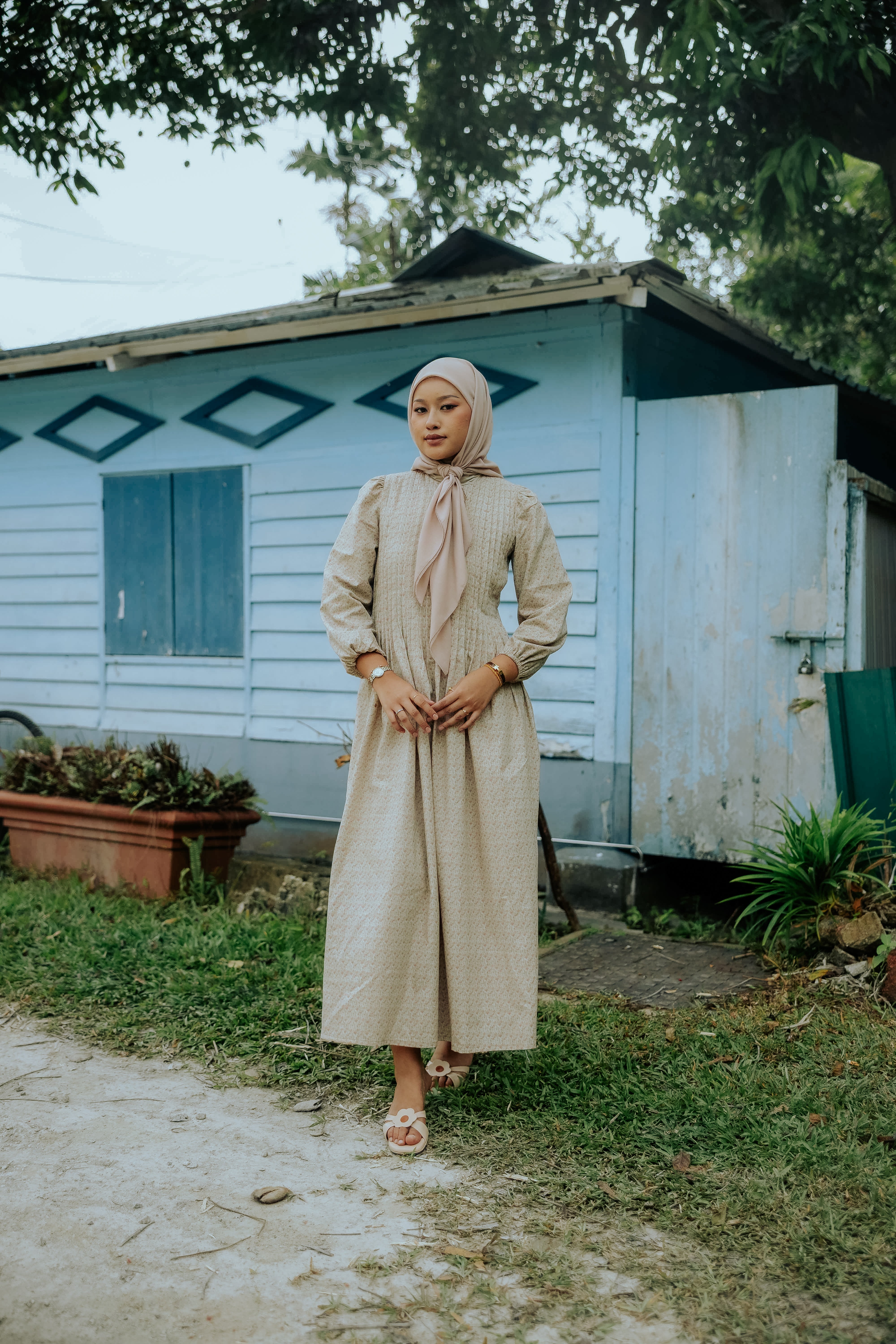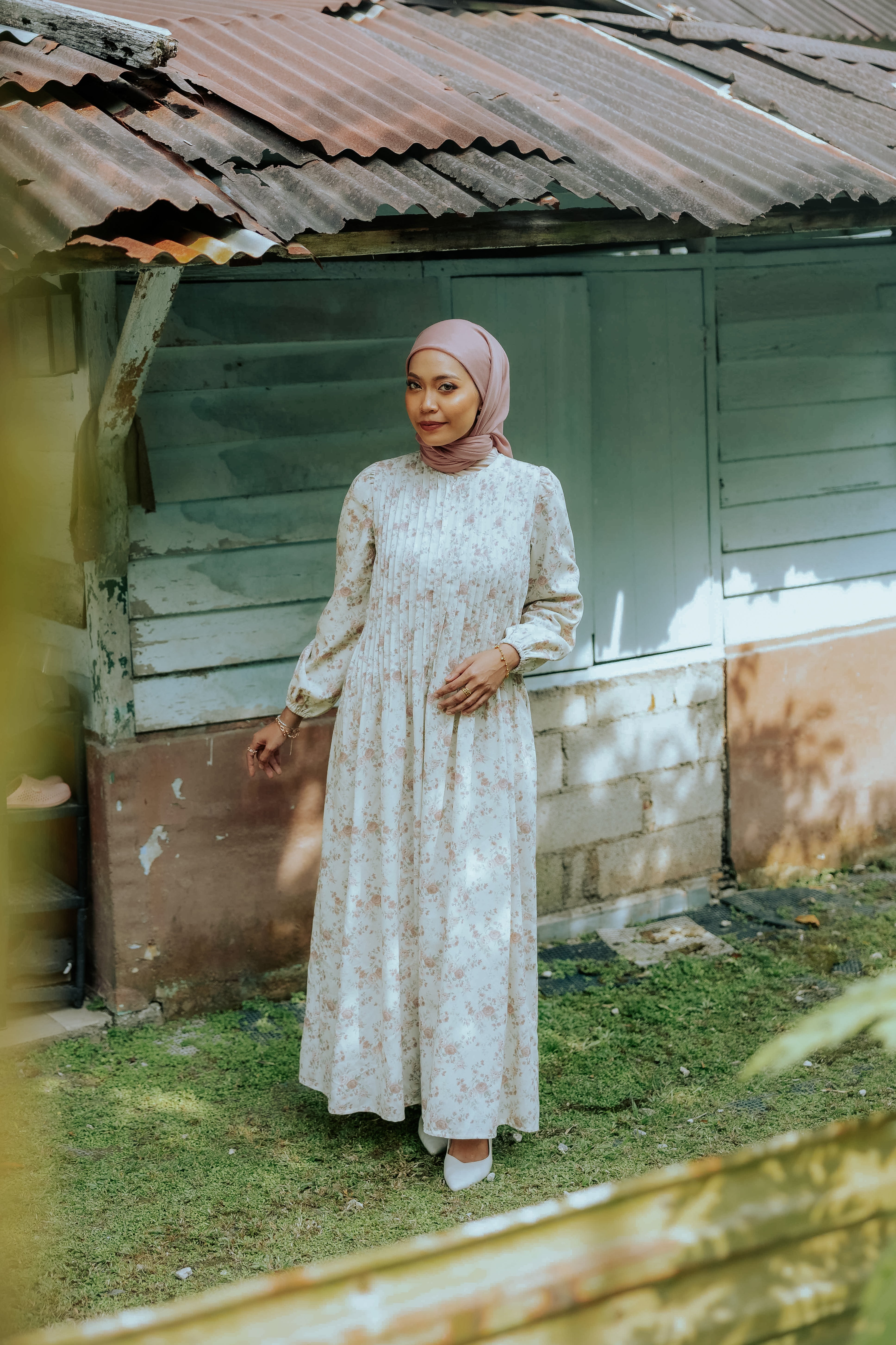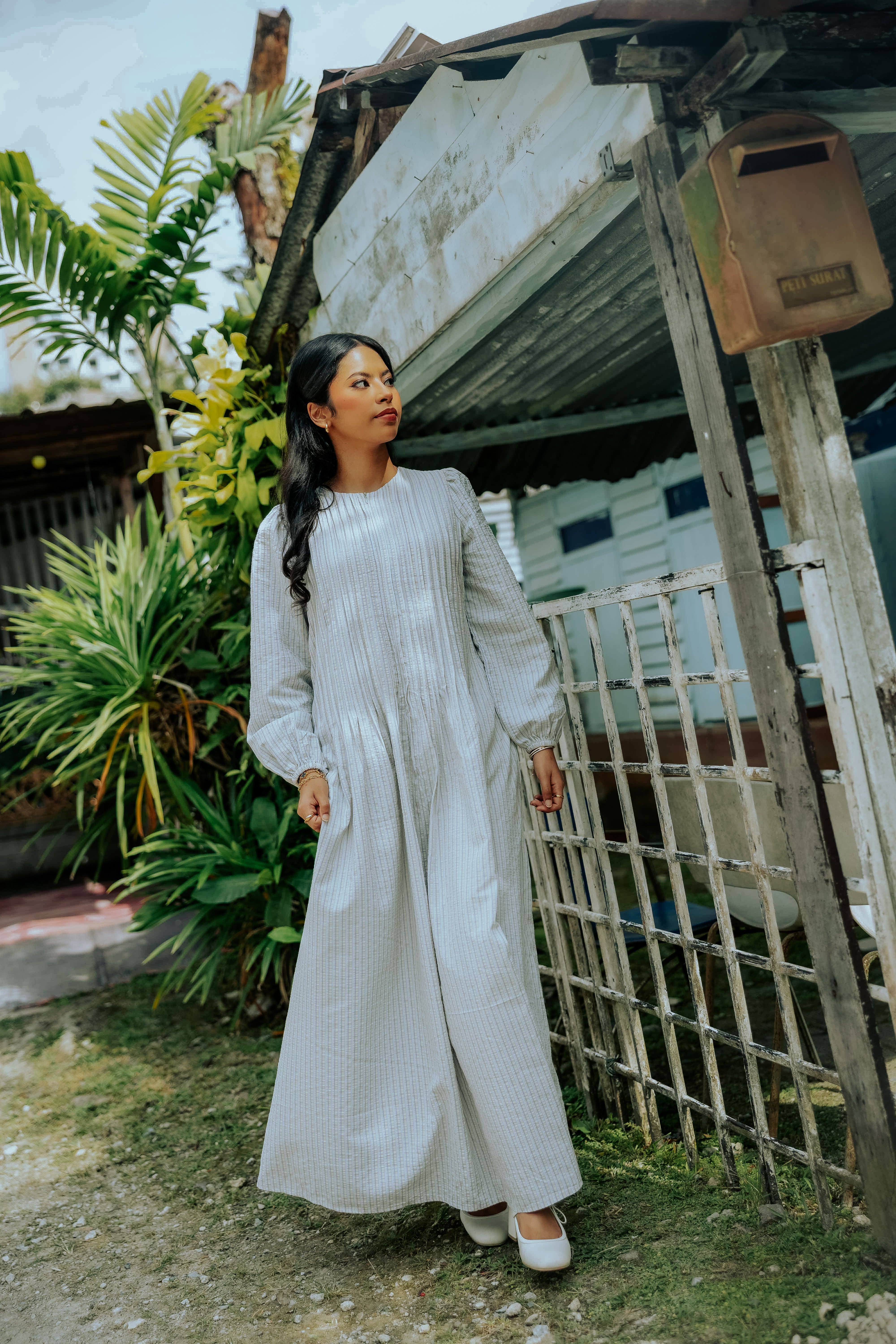 Designed with pleated detailing at the chest and a hidden front zipper for ease and comfort, Mabel blends practicality with timeless style. Its relaxed silhouette flows gracefully, exuding quiet sophistication while maintaining a modest charm.