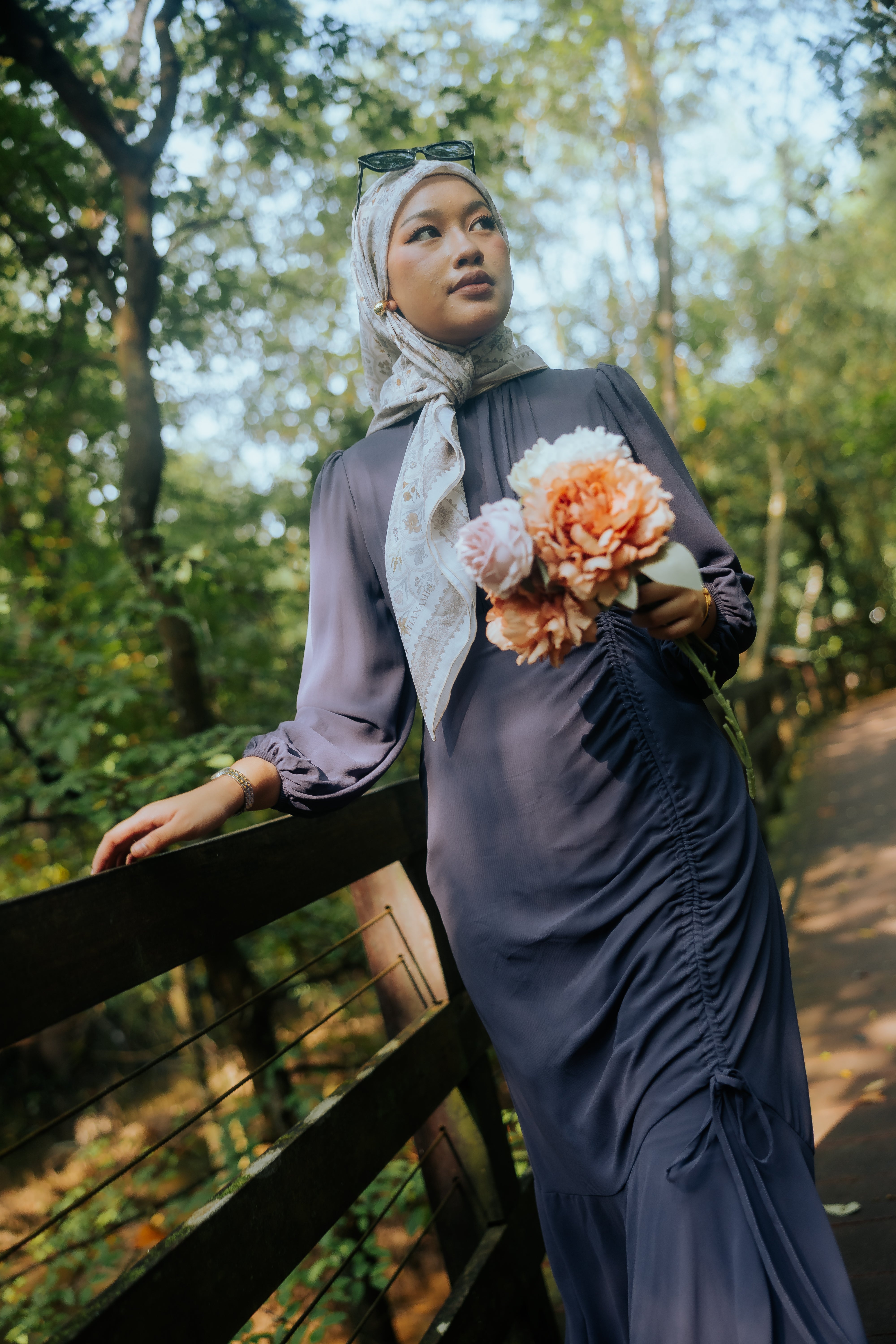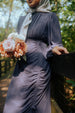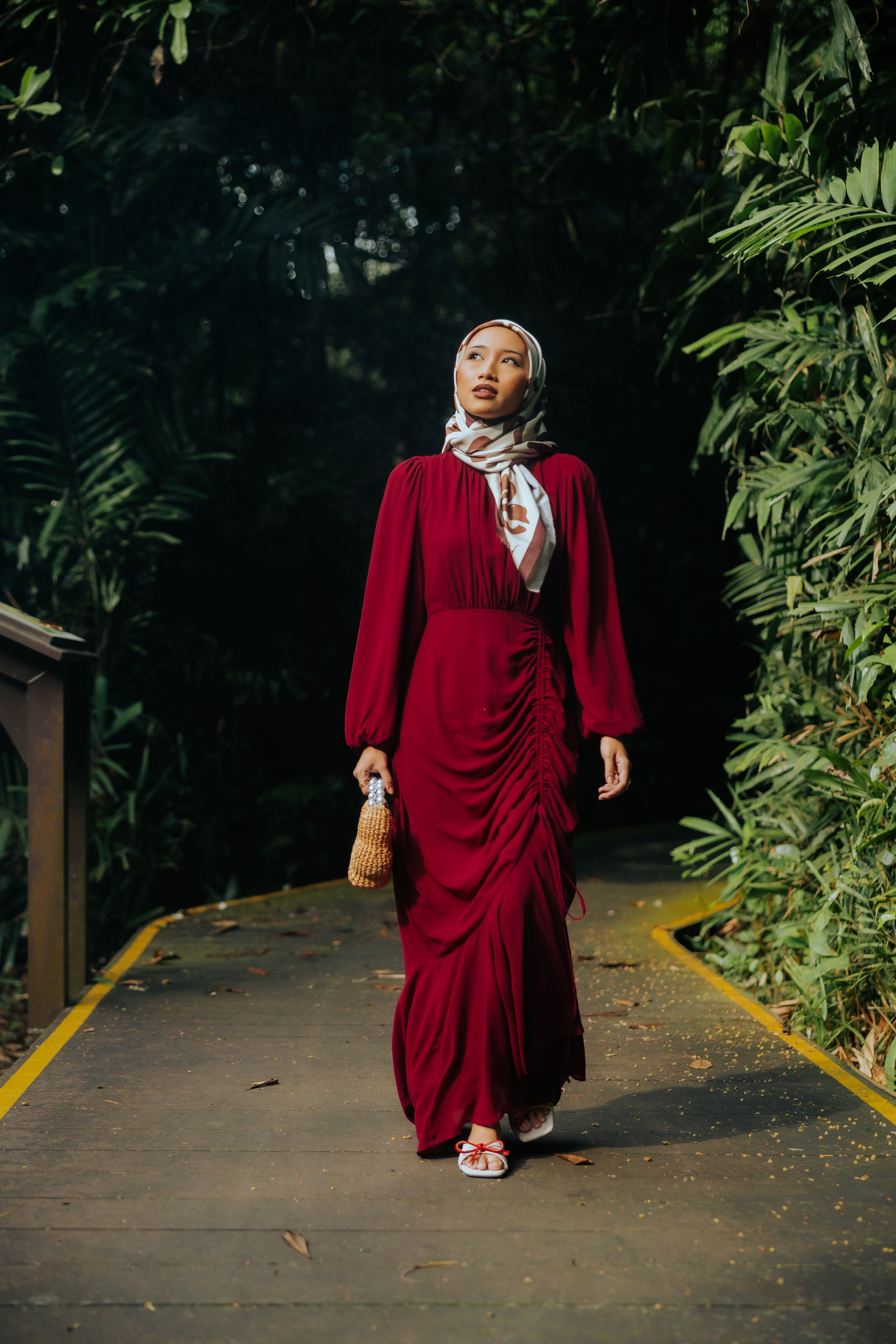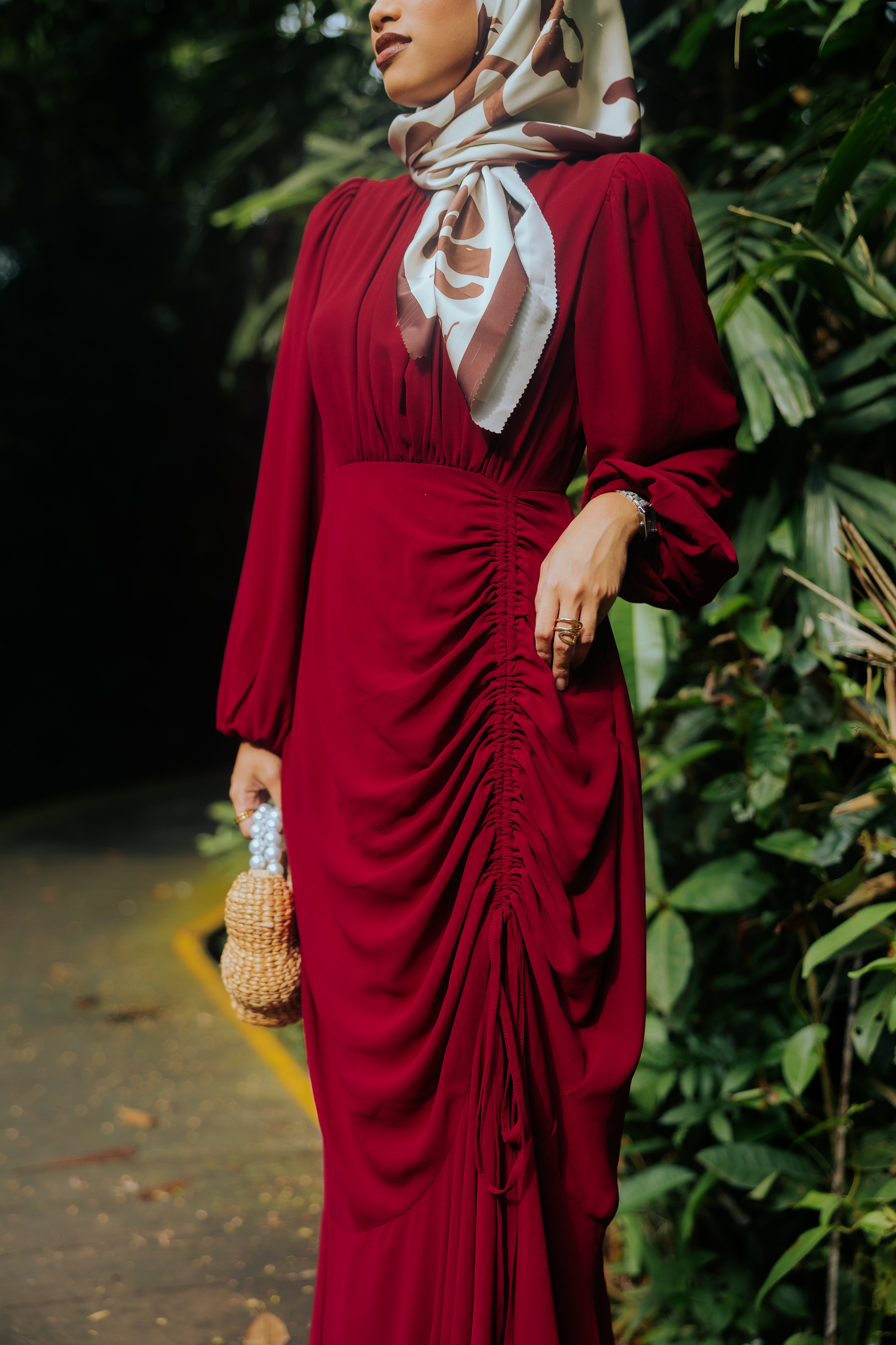 The signature rusching along one side sculpts gracefully, while the long sleeves and fishtail hem add movement to every step. A blend of comfort, confidence, and elegance ; loved by many, and now here again.