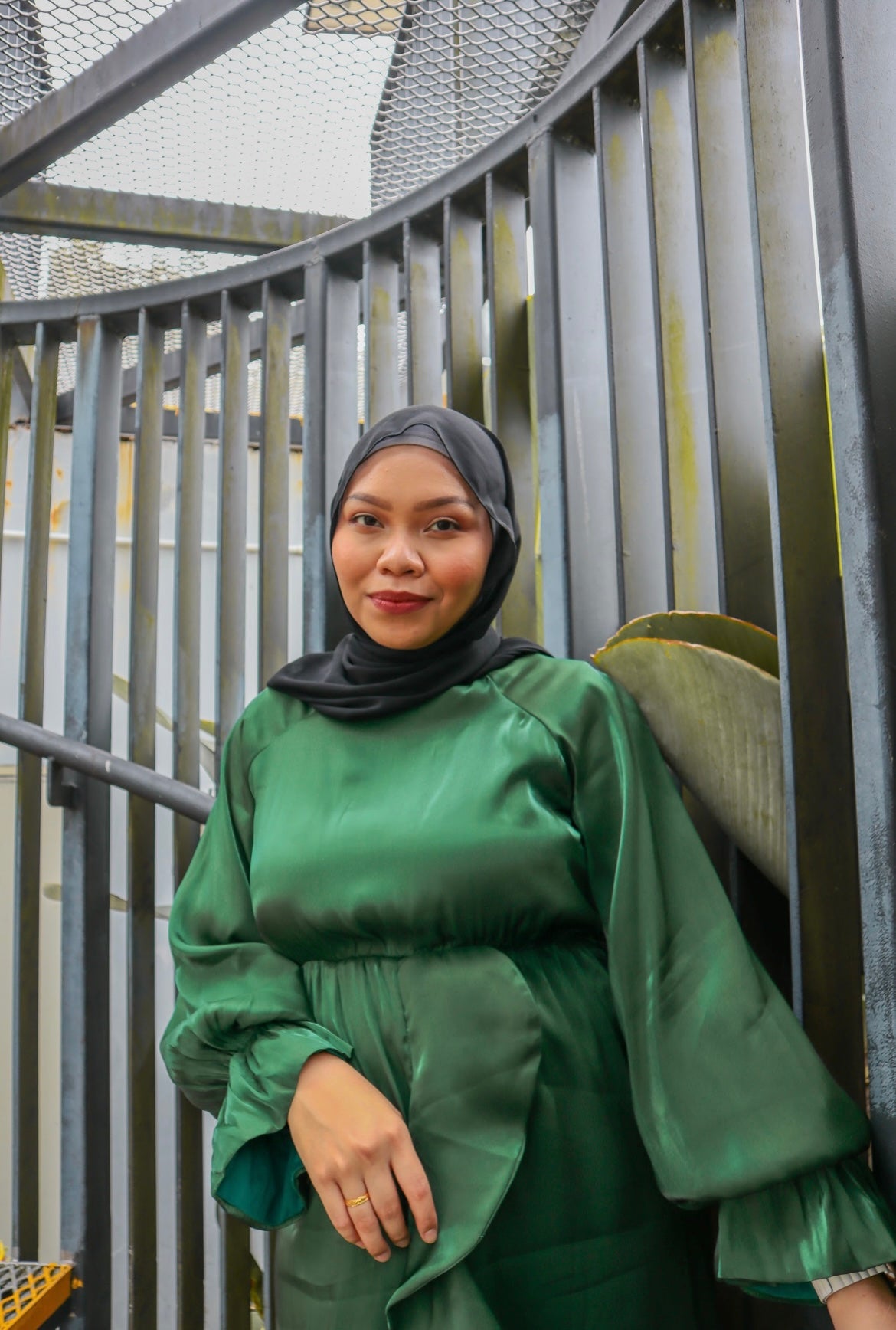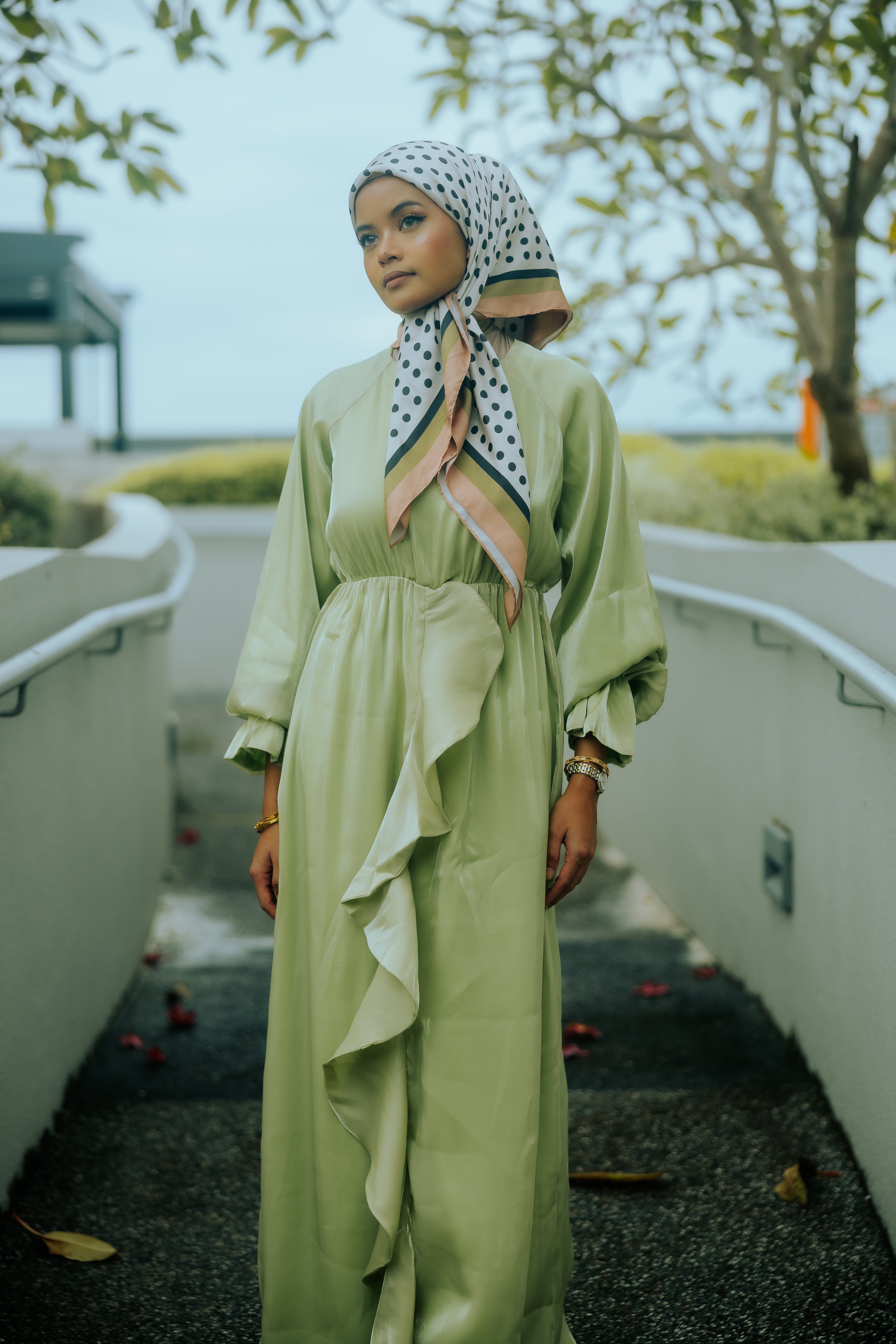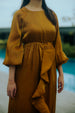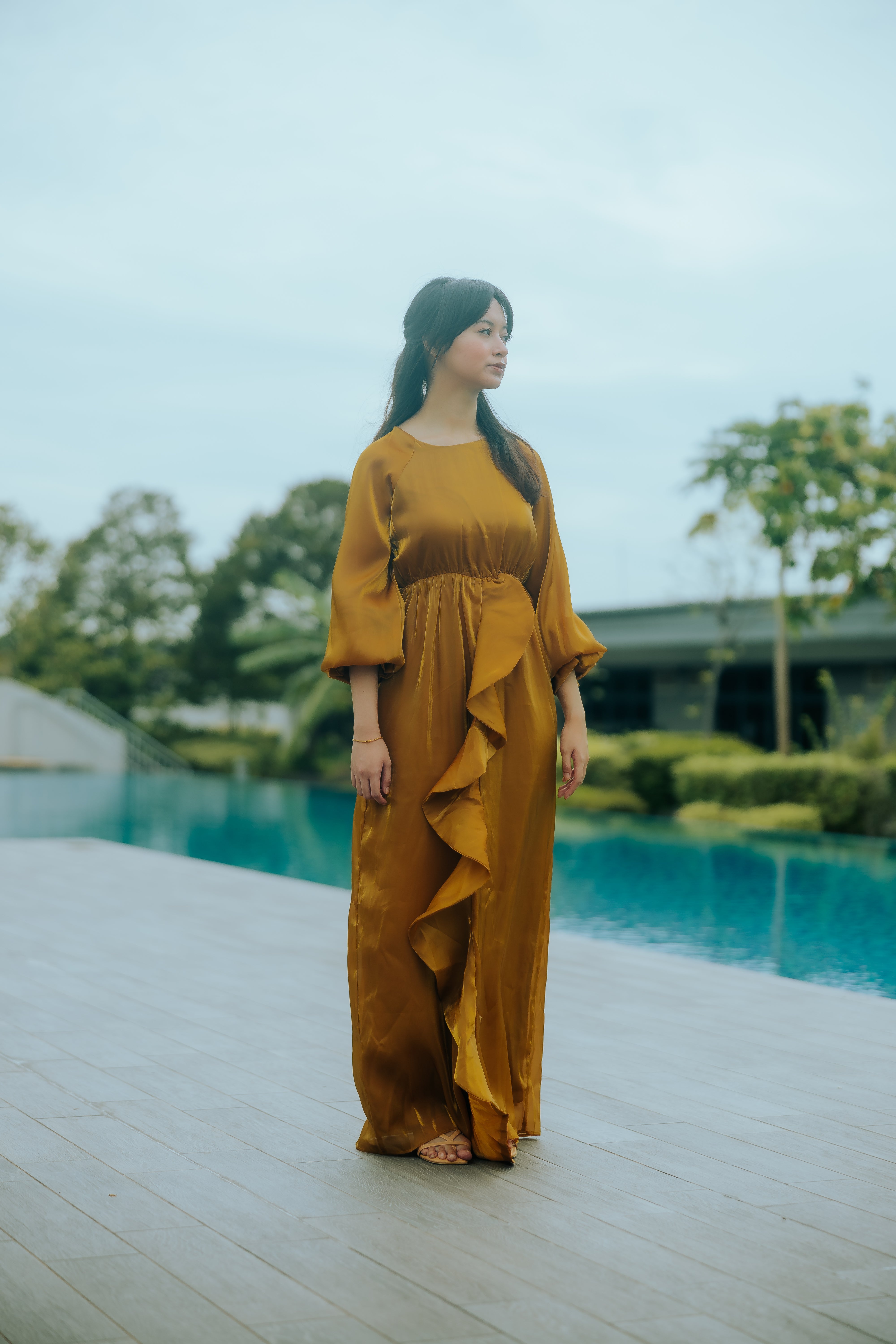 Nadia dress features romantic puffed sleeves, a gently cinched waist, and a flowy silhouette that flatters every figure. A cascading asymmetrical ruffle drape along the front, adding graceful movement with every step.