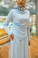 Neckline: Soft draped bateau neckline, gently folding across the collarbone