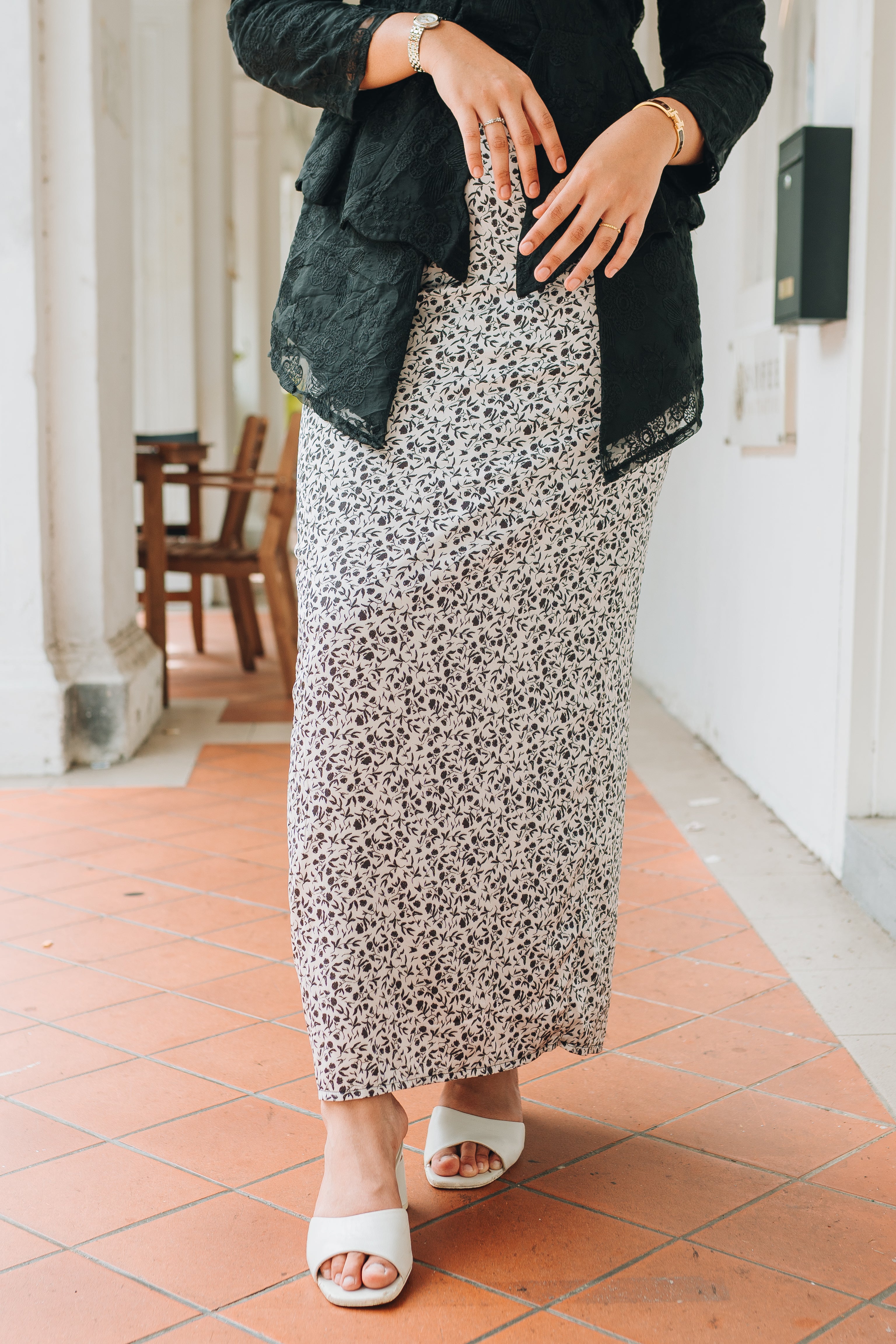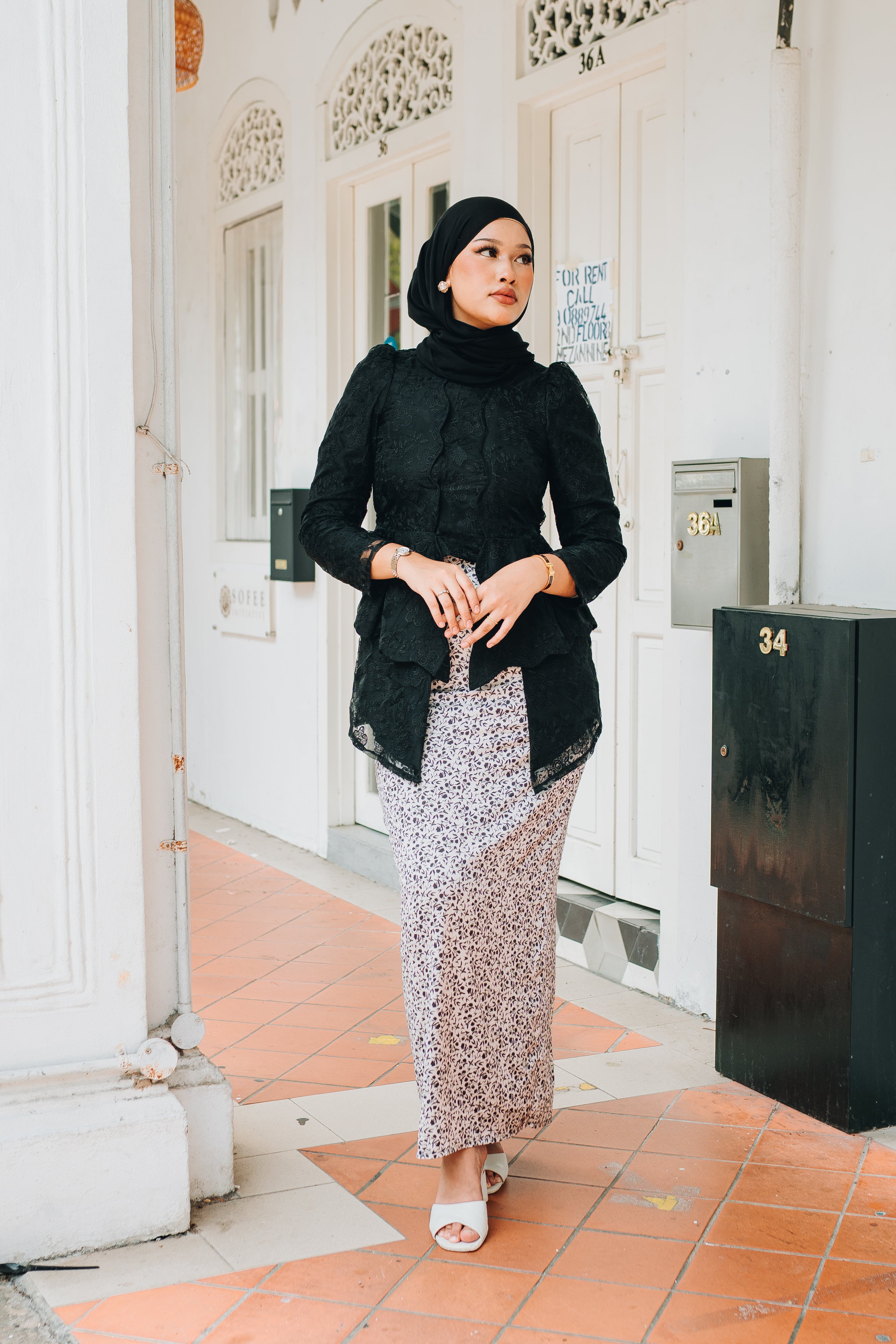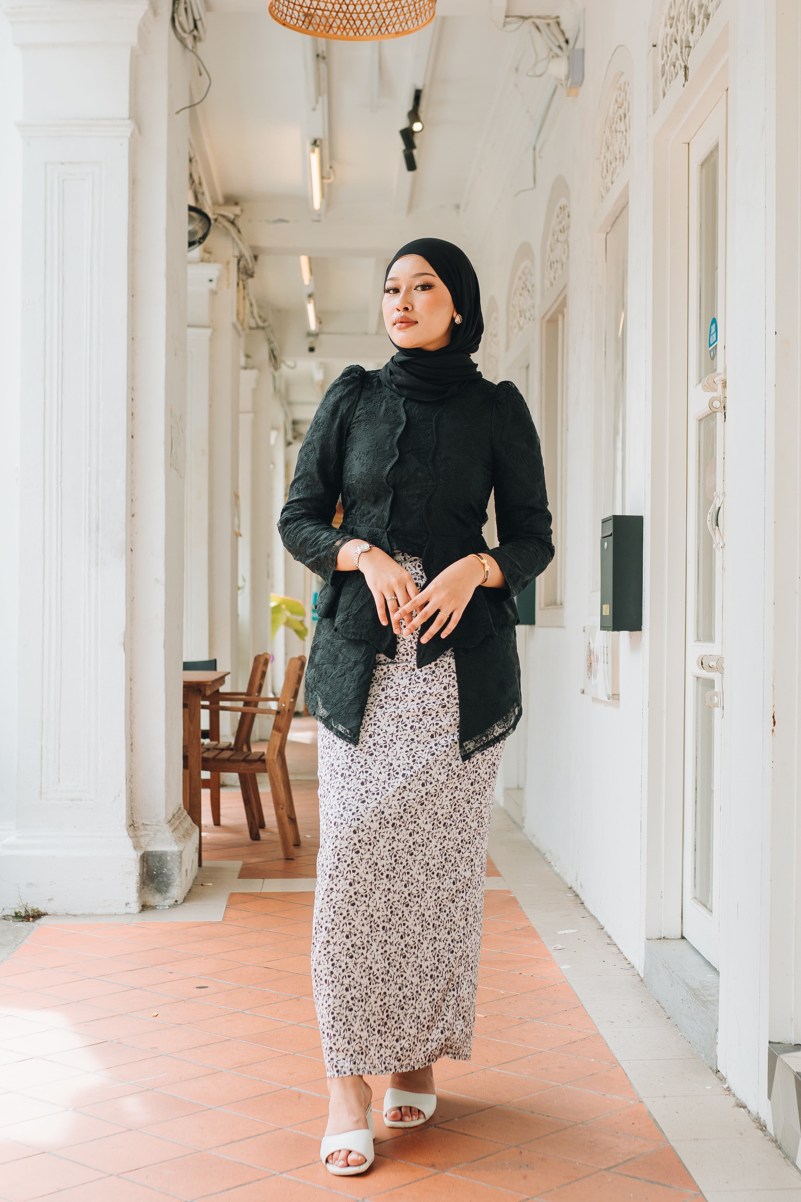 A modern classic with timeless charm, the Zaiton Kebaya is introduced as part of our Alunan Raya – 4th Drop, celebrating grace, heritage, and thoughtful design. The kebaya top is crafted from delicate lace eyelet material and fully lined for a polished yet comfortable fit. It is paired with a flowing printed satin skirt that adds movement and softness to the silhouette.